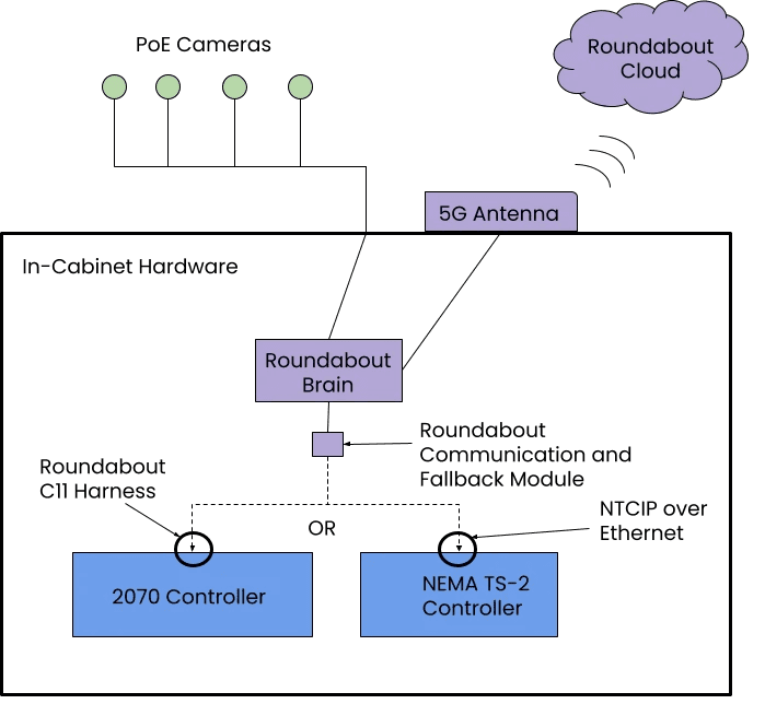 The Roundabout Brain uses cameras to create a comprehensive, live map of all road users (vehicles, pedestrians, cyclists, buses, and emergency vehicles) updating 10 times per second for complete situational awareness.